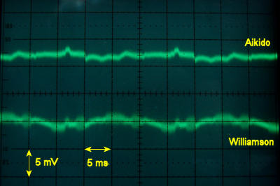 Nastąpił właściwy moment dla rozstrzygnięcia, czy układ wejściowy Aikido ma praktyczną przewagę na typowym stopniem wejściowym Williamsona. Dla zmniejszenia błędów pomiary wykonywałem jednocześnie (w jednym kanale obwód Aikido, w drugim Williamsona, zamieniając kanały w czasie trwania testów).