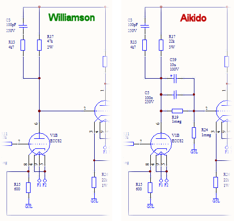 W niektórych wzmacniaczach (również w oryginalnym schemacie Williamsona) napięcie zasilania doprowadza się do rezystorów anodowych R17 i R18 poprzez dodatkowy potencjometr montażowy, pomagający wyregulować symetrię układu dla przebiegu zmiennego. W praktyce układ dobrze radzi sobie z niewielką asymetrią przebiegów i zastosowanie dwóch równych rezystorów anodowych jest w zupełności wystarczające.
