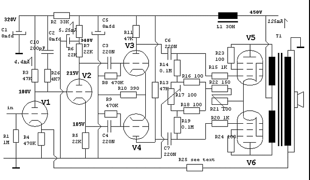 Rezystory R22 i R23 doprowadzają sygnał globalnego ujemnego sprzężenia zwrotnego. Wzmacniacz w otwartej pętli posiada wzmocnienie około 90. Przy zamkniętej pętli sprzężenia zwrotnego wzmocnienie spada do niespełna 20. Głębokość pętli (dla pokazanych wartości elementów wynosząca 13dB) ustalana jest wartością rezystorów R22 i R23 (wpływ ma również ustawienie potencjometrów R3 i R4). Całkowite wysterowanie wzmacniacza (moc 25W) osiąga się dla sygnału wejściowego o amplitudzie około 1V, nie będzie więc problemu z wysterowaniem wzmacniacza z typowych źródeł dźwięku (CD, tuner, magnetofon).