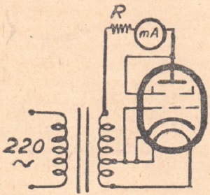 图1.测试电子管的最原始设备的操作原理。 所有电极均连接到阳极或阴极。 获得了一个单向整流系统,该设备测量了整流电流,这在一定程度上取决于阴极的发射率。 本文中讨论了该工具的缺点。
