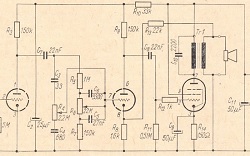 从图 1 所示的示意图中我们可以看出,该放大器适合使用不同电压(从 220 V 到 110 V)的交流电源供电。 从“输入”侧到放大器的前两个真空管,即 6SC7 和 6AC7 真空管 - 起到所谓的作用 “前置放大器”,其中从麦克风、转盘或无线电接收器接收到的电压获得适当的高度以正确控制末级,该末级由反转“相位|”的6SN7电子管组成 和放大,以及两个以推挽方式运行的 6L6 真空管,为扬声器提供必要的动力。