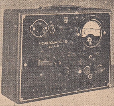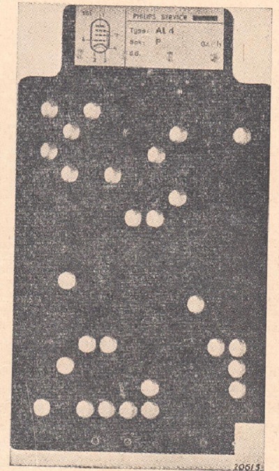 同一原则的改进和改进是飞利浦摄像头。 这里的卡是用坚硬的材料制成的。 将它们插入,推入一个特殊的插槽,然后用盒子侧面的杠杆推开。 由于这种机芯,140个弹簧接触叶片压在贝克利特卡的平面上,但是当然,只有那些相反的漏洞通过并进行接触,将所需的电压施加到适当的电极上,自动而不是手动地将 在先前描述的模型中。 前面板上有八个按钮,它们连续打开,并测试真空管,最初是用于电极之间的短电路,最后是良好的,或者如果您喜欢 - “发射”。