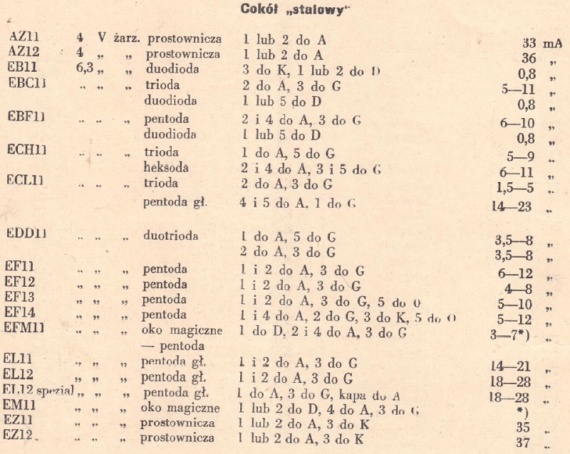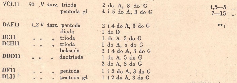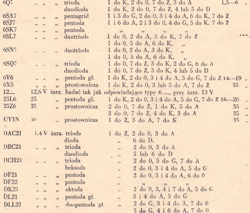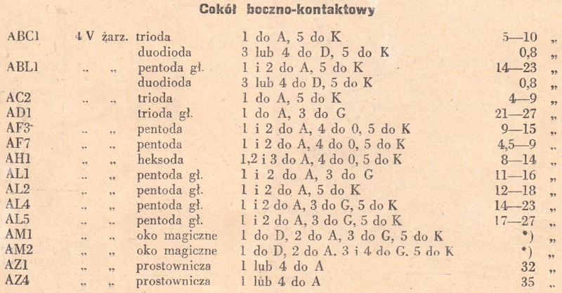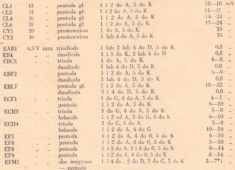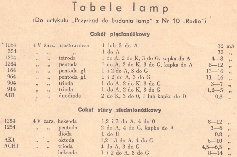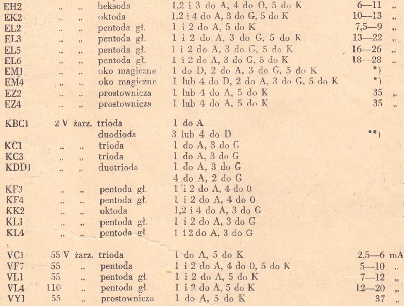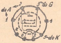 在图3中的示例中,最好解释设备及其功能的原理。我们有一个AL4真空管的电极系统。 我们看到阳极连接到插头1,屏蔽到插头2,栅极为3,阴极为5。因此,我们将这些插头一个接一个地插入合适的插座,使该真空管所有功率所有功率 它需要测试电压。 我们在打开电源之前和完成此操作之前要这样做 - 如果没有犯错,我们会再次检查以要小心。 然后,我们当然通过安全性打开电源,并查看应该点亮的霓虹灯,因为在开关的第一次接触中,它只是显示了整个灯丝。 然后,缓慢而小心地,我们跳过触点,观察电子管的白炽灯,并在4伏发光下停止。 现在,您必须等待一段时间,直到电子管变热并且毫计时表开始偏转(分流器应连接,设备的灵敏度为50毫安)。 如果没有任何可疑的话,请将钥匙切换为充分供应电压,并在网格灵敏度,阴极纤维绝缘和真空上执行上述测试。 下表在下表中给出了毫计时表应偏转的值。 它们是通过勤奋地记录所有电子管获得的结果来获得的。 为此,作者有四个笔记本电脑,其中每个系列的真空管都在笔记本开始或结束时易于访问。 在上角,标记了真空管或几种非常相似的类型(例如EF5和EF9等)。 在每种类型的情况下,都给出了丝电压,在通用真空管的情况下,这一点尤为重要,其中未包含在真空管的标签中。 就在铭文旁边或下方,有一个真空管的底座,带有图4的字母和数字,立即指示在哪里插入香蕉塞。