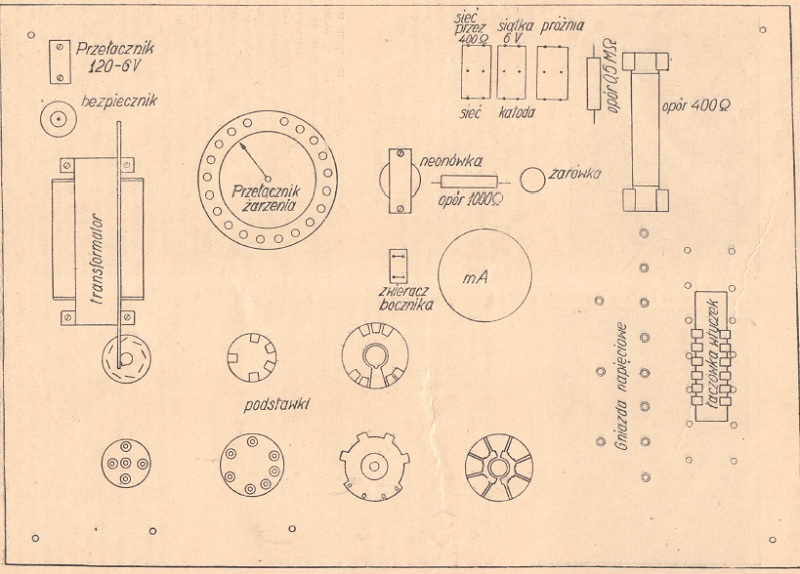 从1到7的数字位于标记插座的轮辋外,请参阅没有固定目的地并根据电子管的类型接收各种电位的端子。 我们以灵活的,几厘米的电缆的形式将它们带到外面,最好是不同的颜色,并用香蕉插头终止于相同的颜色。 将这些插头插入插座中,该插头将为电极提供适当的电势,并且插座乘以乘以,因为我们向阳极和盾牌提供相同的电压。 在某些类型中,有两个或多个网格,等等。