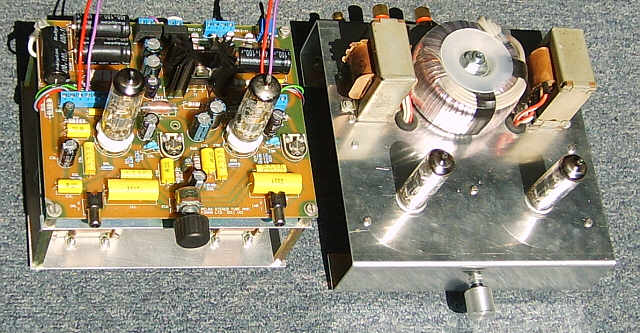 在左侧显示了“塔”形式的放大器。 右边是以传统形式组装的小型铝制底盘的放大器。