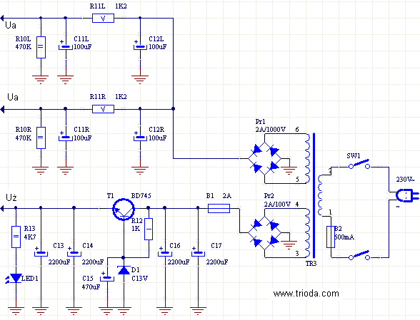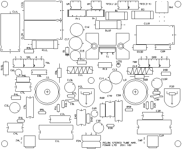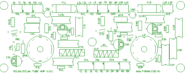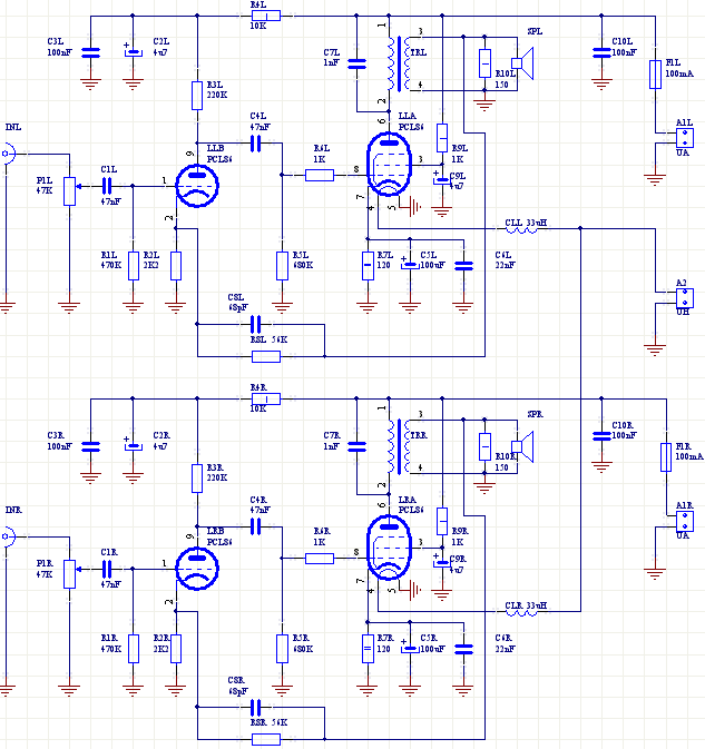 此外,在图 1 中,我考虑了在“Elektronika Praktyczna”杂志 (2/2005) 中发布的版本中构建放大器的所有元素。 要以与“Elektronika Praktyczna”杂志中发布的相同形式组装放大器,必须省略电阻器 R8L、R8R、R9L、R9R、R10L、R10R、R13、电容器 C10L 和 C10R 以及 LED1。 此外,PCL86 管的屏幕必须直接连接到 HT 电源 (Ua)。
